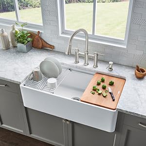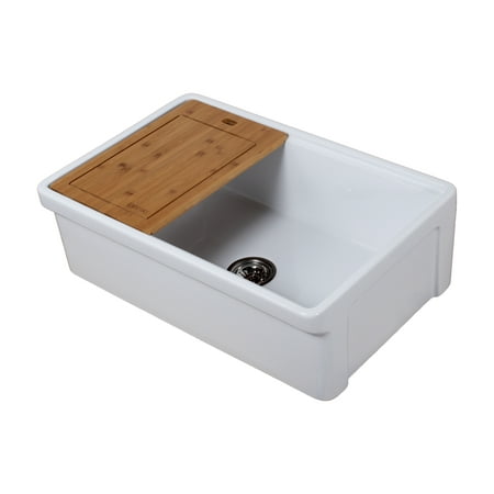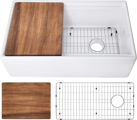 Houzer Platus Series Fireclay Apron Front or Undermount Double Bowl Kitchen Sink with Low Divide, White Finish, 32''W x Tosca Farmhouse Fireclay Single Bowl Kitchen Sink In White With Cutting-Board, Bottom Grid And Strainer, Integral Accessory Ledge Provides An Ideal Work Space For Cutting Board And Rack, Free Sliding Bamboo Cutting Board, Heavy Duty Stainless Steel Grid And Strainer Basket Included, Glazed On All Sides With White Gloss Finish, Fireclay Material Allows For Perfect, Smooth, And Easy To Clean Surface, Reversible Apron Front Design: Top-Lip Or Casement (Beveled Arch) Style, Non-Porous Sink Resists Heat, Stains And Cracking, Artisan Hand-Finishing Techniques, Fired At Temperatures Above 2,100F, Making Them Ultra-Durable, Stain And Chip-Resistant, Waste Disposal Unit Compatible, Recommended To Confirm Waste Disposal Or Drain Maximal Thickness.