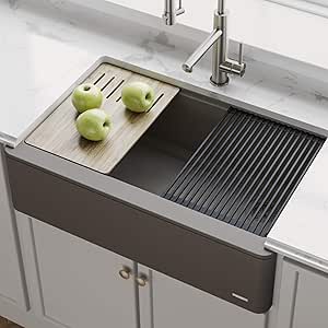 Empire Olde London 27" Wide Farmhouse Fireclay Single Bowl Kitchen Sink with Grid and Strainer, 27" W x 18" D x 10"H, 33" W Single Bowl Apron Front Farmhouse Kitchen Sink, Stainless Steel, 32-3/4" W x 21-1/2" D x 9-5/6" H, Titan 30" W Granite Composite Farmhouse Single Bowl Kitchen Sink, Tan. crafting sadieseasongoods farmhouse beforeandafterbrookside