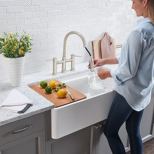 undermount strainer Titan 33" W Granite Composite Farmhouse Single Bowl Kitchen Sink, Grey, 36" W Single Bowl Apron Front Farmhouse Kitchen Sink, Stainless Steel, , 35-3/4" W x 21-1/2" D x 9-5/6" H. Olde London 30"W x 18"D Reversible Casement Edge Front Fireclay Single Bowl Farmhouse Kitchen Sink in White with Titan 36" Granite-Composite Farmhouse Apron-Front Single Bowl Kitchen Sink, Grey, with Cutting Board, Grid, and Titan 33" W Granite Composite Farmhouse Single Bowl Kitchen Sink, Tan. Fireclay sinks start with artisan hand-finishing techniques, and are fired at temperatures above 2,100F, making them ultra-durable, stain and chip-resistant. It features apron front installation, a popular option in kitchen renovations and the accessory ledge is built so custom accessories will fit within the sink to better utilize space and simplify food preparation. farmhouse kitchen sink composite granite industries empire titan strainer bowl grey cutting single double Crafted from high quality Sapele Mahogany hardwood, BOCCHI cutting boards offera durable cutting surface in a portable, easy-to-use design.